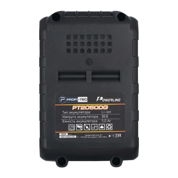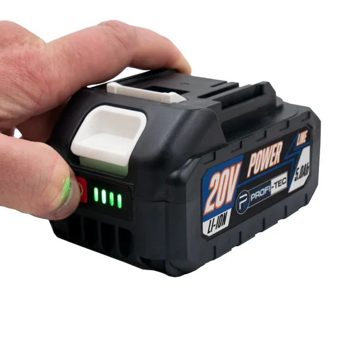 Акумуляторна батарея PROFI-TEC PT2050DG потужністю 20 В / 5.0 Аг, призначена для роботи на інструментах PROFI-TEC POWERLine, відрізняється надійністю та високою тривалістю роботи.