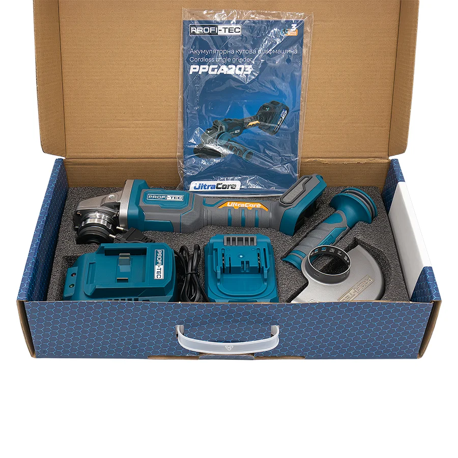 Акумуляторна кутова шліфувальна машина PROFI-TEC PPGA203 UltraCore (1×PT2040VX (4.0 Аг), зарядний пристрій)