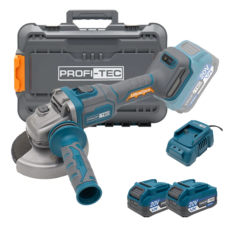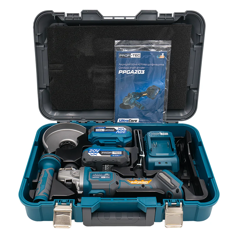 Акумуляторна кутова шліфувальна машина PROFI-TEC PPGA203 UltraCore (2×PT2040VX (4.0 Аг), зарядний пристрій)