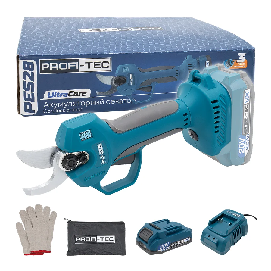 Акумуляторний секатор PROFI-TEC PES28 UltraCore (1×PT2020VX (2.0 Аг), зарядний пристрій)