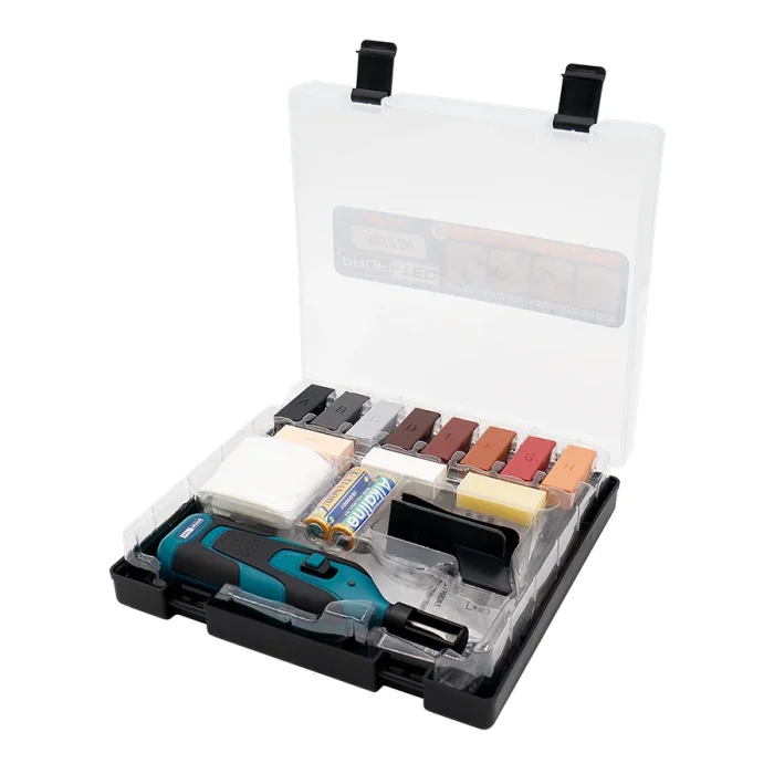 Набір для ремонту PROFI-TEC PRK312 Set – це спеціалізований інструмент, призначений для локального ремонту твердих поверхонь, що зазнали механічних пошкоджень, зокрема подряпин, вм’ятин і відколів. Він підходить для дерев’яних і ламінованих покриттів, таких як підлога, меблі, двері та вікна, а також для плитки, мармуру, декоративного каменю, керамічних виробів і декоративних елементів, відновлюючи їх цілісність і зовнішній вигляд.
